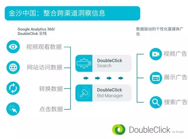 通过使用Google Analytics 360 Suite和DoubleClick,能够整合跨渠道,跨平台的数字信息,形成以用户为核心的数据视角。这些信息包括:用户看了哪些广告,怎么看的,点击了哪些内容,访问了哪些网站——经过这样的分析整理,形成了以用户为核心的数据基础,也让金沙中国更加了解自己的用户以及用户的转化路径。有了这些信息指导,再结合谷歌的整合营销平台,从而使广告活动从设计、执行到优化更加高效,并更有针对性和准确性,并且覆盖了搜索广告、视频广告和展示广告所有渠道。