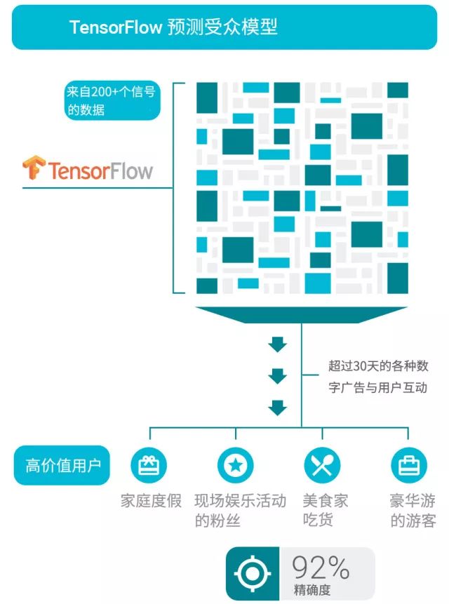 Google使用Tensorflow和Google云平台,搭建了一个预测模型,这个模型能可以识别并且分析用户在各个设备和渠道上跟广告、网站的互动交互行为,标记出处那些具有高可能性转化的潜在用户,精确度高达92%。同时,也会建议哪些广告信息,格式是最合适投放的,从而在接下来的30天内用各种数字广告与用户互动,打动他们。