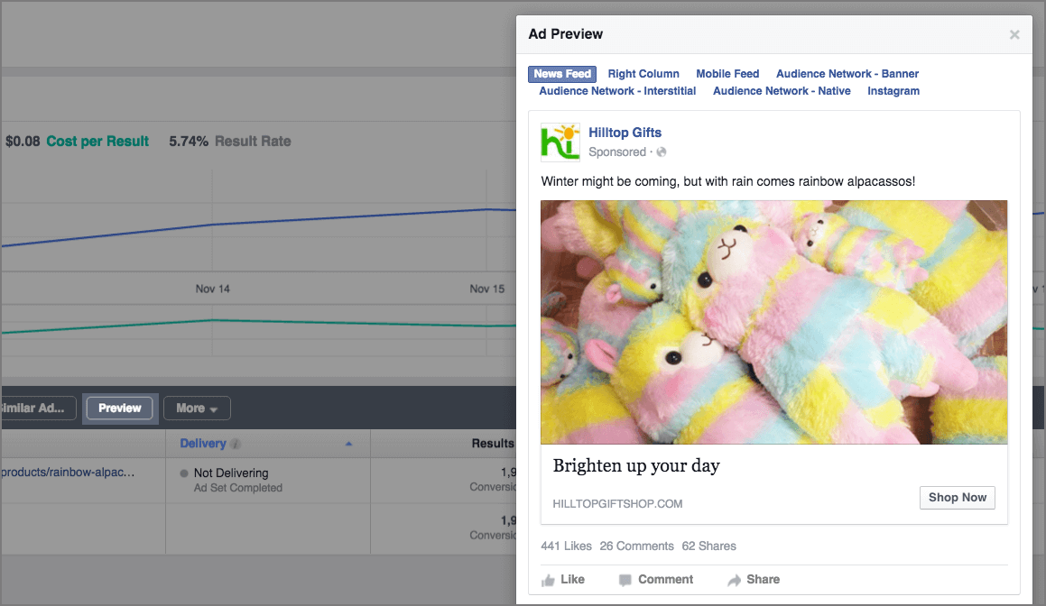 请记住,您可以在广告管理工具中预览广告。预览广告时,您可以查看广告在各个版位(例如:右边栏、Instagram)中的展示效果。